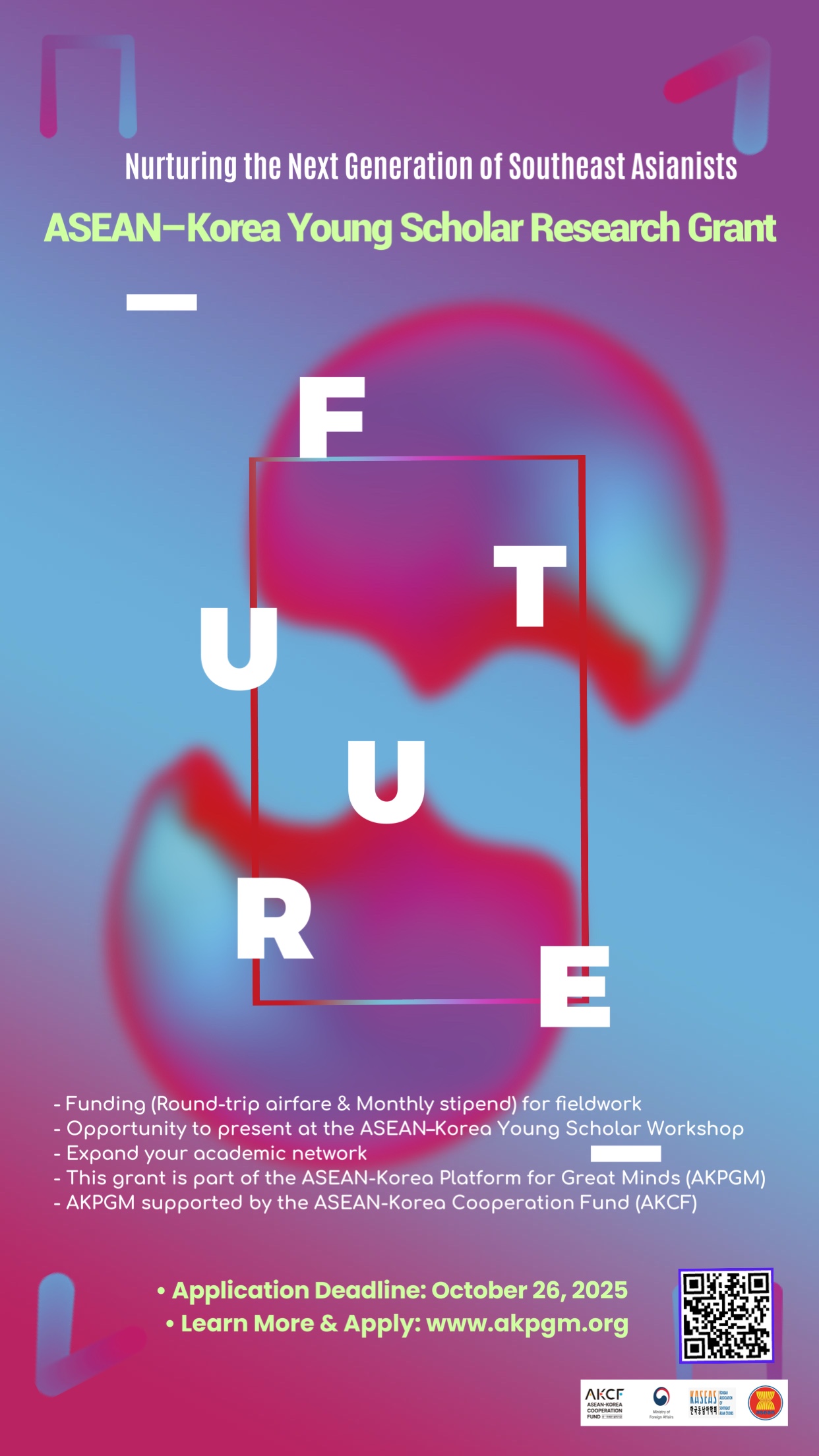 한-아세안 동남아연구 협력 사업(AKPGM, ASEAN-Korea Platform for Great Minds)은 한-아세안 협력기금(AKCF)의 후원으로, 한국동남아학회(KASEAS)가 주관하고 있습니다. AKPGM의 주요 사업 중 하나인 한-아세안 대학원생 현지조사 지원 장학금 신청자를 10월 26일까지 모집합니다. 관심 있는 대학원생들께서는 용기 내어 도전해 보시길 바랍니다.