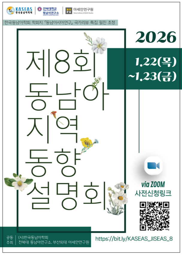 전동연은 (사)한국동남아학회, 부산외대 아세안연구원과 함께 2026년 01월 22일(목)과 23일(금) 이틀에 걸쳐 제8회 동남아지역동향설명회를 개최했습니다.