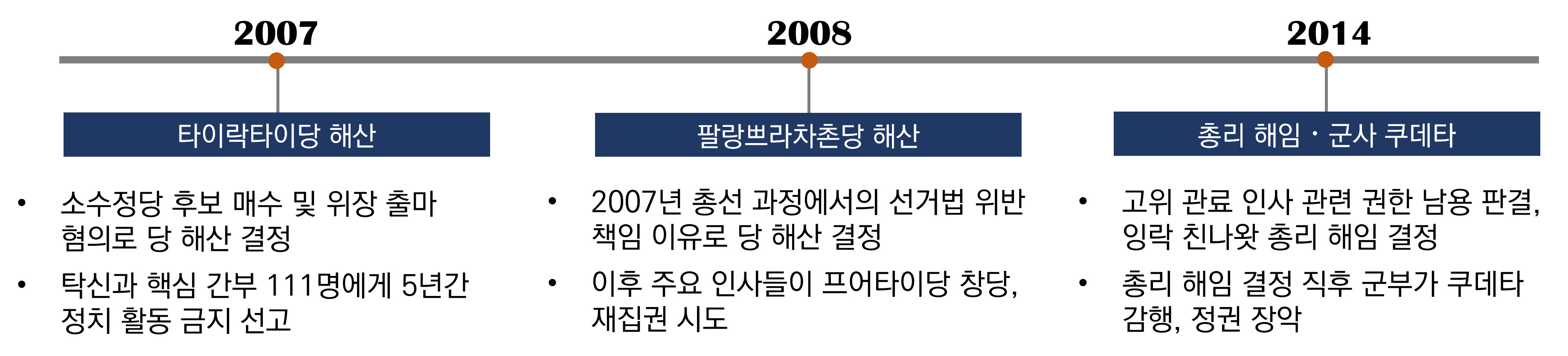 1) 2006년~2025년 사이 태국에는 두 차례의 쿠데타와 최소 다섯 차례의 주요 정당 해산, 그리고 네 명의 총리 퇴진이 반복되었다.