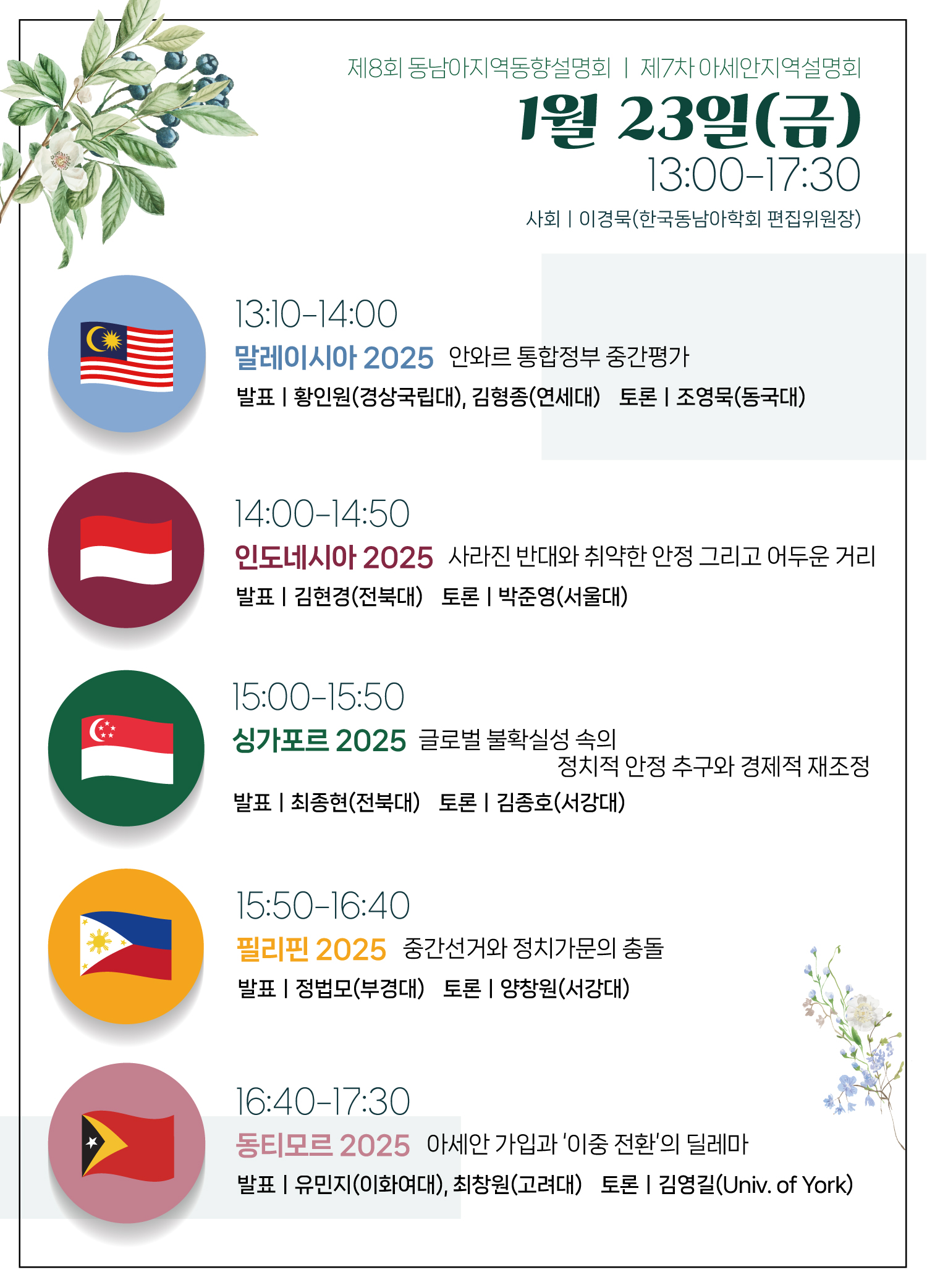 올해 8회차를 맞이한 동남아지역동향설명회는 (사)한국동남아학회가 발행하는 학술지 「동남아시아연구」에서 매년 특집호로 기획 출간하는 동남아 지역 동향 리뷰 필진이 지난 한 해 동안 발생한 각국의 주요 이슈에 관한 전문지식과 정보를 학회원, 연구자, 대학원생 및 일반 대중과 공유하는 연례 학술행사입니다. 정치, 경제, 대외관계(한국과의 관계 포함)에 관한 내용을 기본골격으로 삼되, 주목할 만한 사회문화적 현상이나 쟁점도 함께 다룹니다.